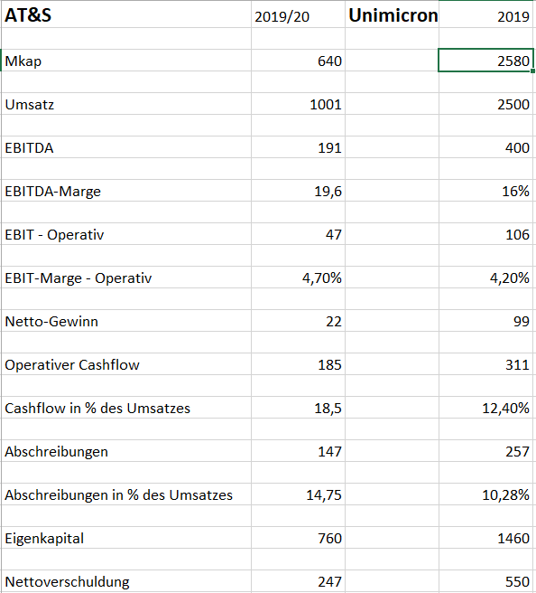 Unimicron ist mit heute mehr als 4 mal so teuer wie AT&S und das etwa bei doppelter Unternehmensgröße - siehe die nachfolgende Tabelle:
