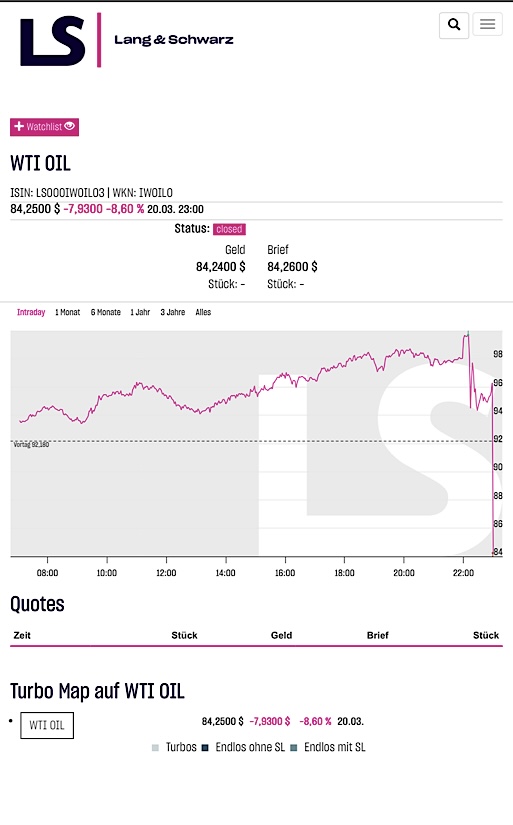 die € 86.-unterschritten, das wird eine richtig fette rote Wochenkerze. Das könnte die Basis für nächste Woche sein um die € 86.- endgültig nach unten zu brechen. Wenn es weitere negative Meldungen zum Krieg gibt, dann wird es immer wahrscheinlicher das man die € 82.- ansteuert. Nach oben zur Zeit NULL Druck.