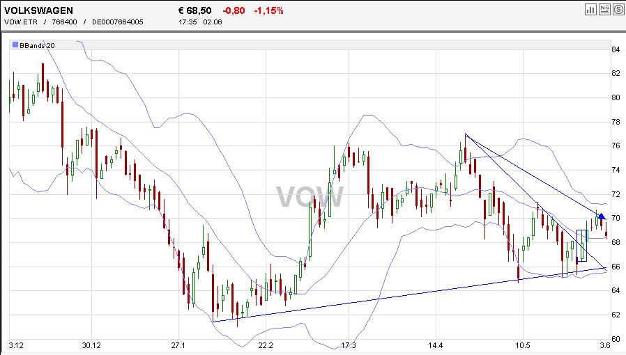 Demzufolge ist damit zu rechnen, dass der Dow absackt. Ausserdem kommt zu der Ölpest jetzt auch noch die Sturmsaison in Amiland. Öl + Hurrican = keine guten Vorzeichen für den Dow. Dazu dann noch Nordkorea, Israel, Iran …. irgendeinen Grund für einen Krieg werden die Amis wohl finden mit Hilfe der Israelis, dann kann man von den wirklichen Problemen so schön ablenken. Amiland ist bankrott. UK ist bankrott und mit Hilfe unserer spanischen und französischen Freunde ist auch Euroland bald bankrott (Italien und Frankreich stehen kurz davor von AAA abgestuft zu werden). Daher sehe ich z. Zt. keinen Grund irgendwelche Aktien zu halten. Die EZB ist zu einer Bad Bank umfunktioniert worden. Zwischen Berlin und Paris kriselt es demzufolge. Das deutet alles eher darauf hin, dass es vorläufig eher nur runter gehen kann, auch für VW, die sich jetzt wie eine konservative Aktie verhält. Ich würde mich da nicht auf Charts oder Systeme verlassen. Wenn Du das anders beurteilst, lass es uns wissen.