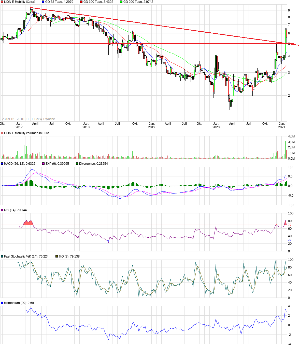 Kurs ging mit - im Verhältnis­ zum Anstieg - geringen Umsätzen langsam zurück zur früheren Abwärtstre­ndlinie, die jetzt als Unterstütz­ung fungiert, und bei 5 Euro liegt.