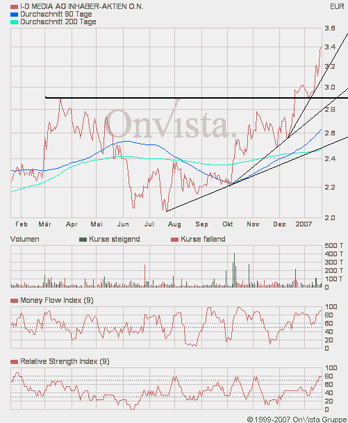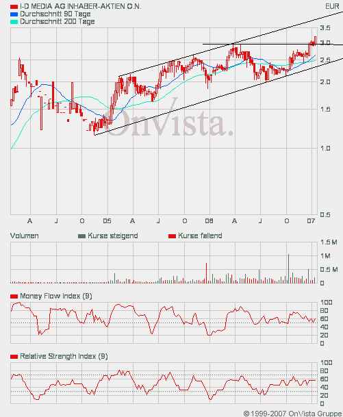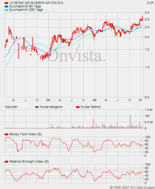 Die Aktie von I-D Media schloss heute auf XETRA bei 3,40 Euro (+1,19 Prozent). (19.01.2007/ac/n/nw)