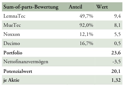 mit rund 13 Millionen Euro Marktkapitalisierung zugrunde legt, bleiben für die rund 11% der DEWB aktuell nicht mal mehr 1,5 Millionen Euro. Da ist wohl noch einiges mehr an 'good will' beim Kursziel der DEWB anzusetzen oder schon eingepreist. Vorteil der DEWB Aktie gegenüber NOXXON direkt an der EuroNext bleibt damit wohl nur noch die Beteilungsmöglichkeit an den nicht börsengehandelten Unternehmen und der Handel an deutschen Börsenplätzen.