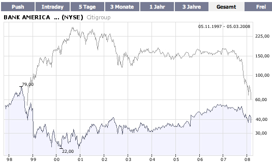 Diese Kurse hätte vor 1. Jahr niemand prognostiziert. Eine Citigroup legt sich mit der 20 USD Marke an, eine UBS kurvt um Euro 20 herum. Mit beiden Aktien hat man mal locker rund 70% Kursverlust produziert. Von IKB, COBA, RBS, BARCLAYS etc. ganz zu schweigen.