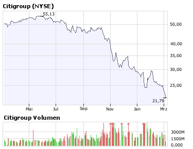 Also liegt der faire Wert von Citigroup für mich bei 20 Dollar, falls es nicht zur Pleite kommt. Erst wenn dieser Kurs deutlich unterschritten wird, kann man spekulativ einsteigen.