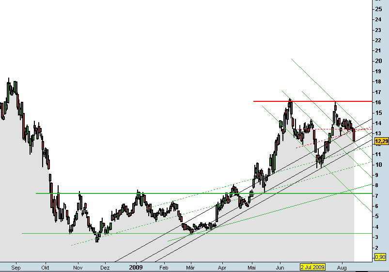 wir haben´s aktuell mit dem abschluss der rechten Schulter einer inversen SKS Formation zu tun. Rechte Schulter TiefPunkt aktuell erreicht (linke Schulter Tief am 22./23. Juni (um die 12$), schätze ab heute bis spätestens ein Tag nach den Zahlen geht´s gen Norden. Dann letzter Aufsprung bei Rücksetzer auf die Nackenlinie bei ca. 16$.