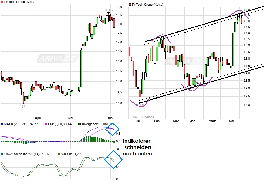 Kommt jetzt die Gegenreaktion auf den zuvor so heftigen Anstieg Anfang Mai? Sieht technisch nicht so gut aus mit frischen Verkaufsignalen. Indikatoren haben schon Ende letzer Woche nach unten geschnitten. Der seit Sommer 2016 steigende Aufw.trendkanal wurde oben tangiert, aber man prallt nach unten klar wieder ab. Mal schauen wie lange man jetzt braucht zum technischen "durchatmen". Bin Ende letzter Woche jedenfalls erstmal mit dem Großteil der Posi wieder raus und warte auf bessere Signale. Gesamtmarkt wirkt auch etwas verunsichert. EZB-Sitzung, Stress um Katar, Englandwahl, FED-Sitzung/Zinsschritt und großer Verfallstag steht in der nächsten Zeit gebündelt an. Da wartet mancher Anleger vielleicht erstmal ab, wie das alles ausgeht bevor er wieder frisches Geld in den Markt gibt.