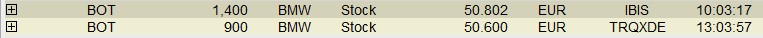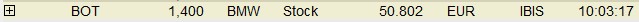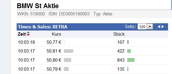 Soll uns dieses Bildchen beweisen, das Du heute um 10.03 Uhr 1.400 BMW-Vz-Aktien für 50.802 € gekauft hast? In diesem Bild taucht "IBIS" auf. IBIS war 28.11.1997 der computergestütze Handel, bevor es von XETRA abgelöst wurde. Schaut man bei XETRA die heutige Times and Sales an, so gibt es keine Umsatz von 1.400 Stück. Grosser Zweifel.
