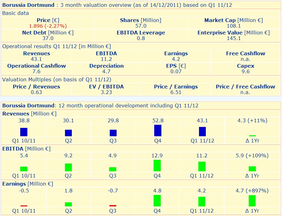 "Nur, die Aktie war schon vor all diesen wirklich schlechten Nachrichten krass unterbewertet. Es gibt nichts, wirklich gar nichts, was diese Bewertung rechtfertigt. Zwar gibt es einige Aktien, die extrem unterbewertet sind. Allerdings sind diese Aktien von dem drohenden Rezessionsszenario betroffen, von dem der BVB nicht so stark betroffen wäre. Im Gegenteil, die Schuldenkrise hat u.a. dazu geführt, daß Italien nicht mehr mit zig Millionen Schulden Spieler kaufen kann, und schwupp, Deutschland zog im UEFA Ranking vorbei und hat jetzt einen Starterplatz bei der Champions League mehr. Der Trend wird sich vermutlich fortsetzen, viele englische und spanische Vereine haben nicht tragfähige Schuldenkonzepte. "