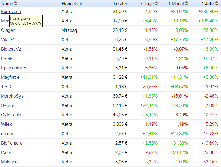 Noch mal eine Statistik der deutschen Biotechs seit genau einem Jahr.