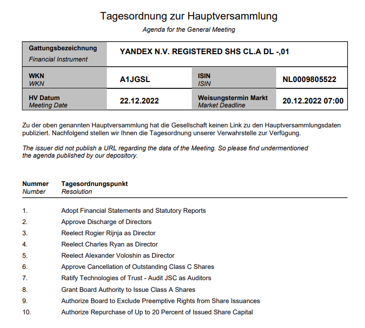 Ich habe keine Info bekommen, dass eine HV stattfinden soll. Was könnte denn deiner Meinung nach Yandex wert dann sein, wenn die Abspaltung vollzogen werden sollen? Ich bewerte diesen Schritt insgesamt positiv. Was sagst du? Der ganze Schrott (etwas übertrieben) soll bei Yandex-Russia verbleiben. Deine Meinung interessiert mich sehr...