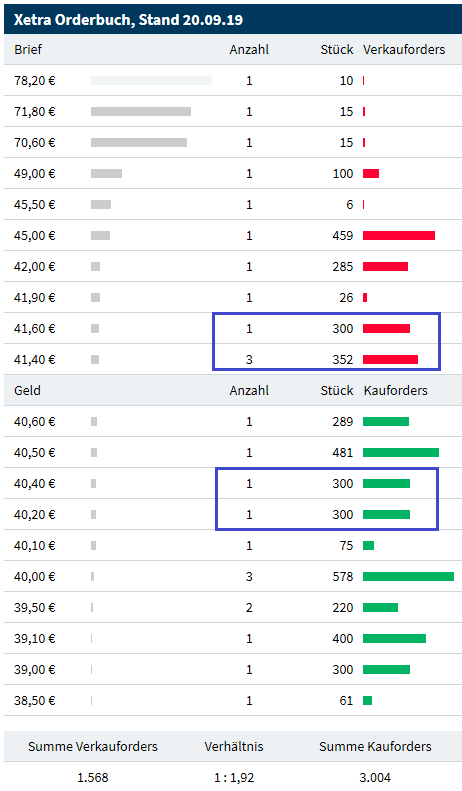 Im Ask faktisch nur die 2x400 Stück des Marketmakers, aber im Bid jede Menge Kaufinteresse.
