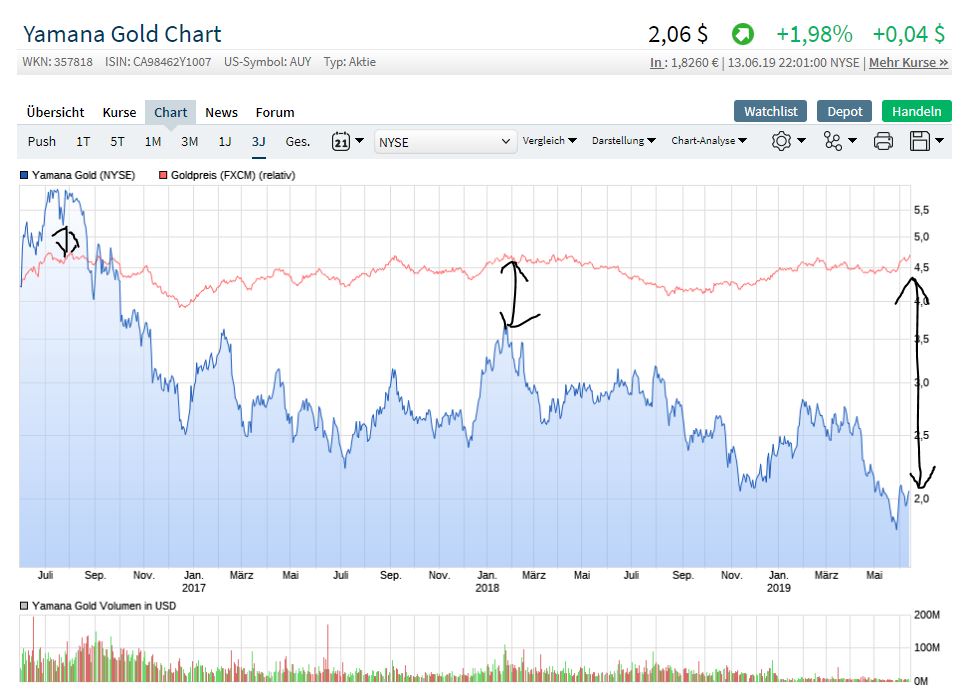 Mitte Juli 2018 stand Gold um 1230 ..also rund 100 unter dem jetzigen Stand , und Yamana um 2,70 € ...