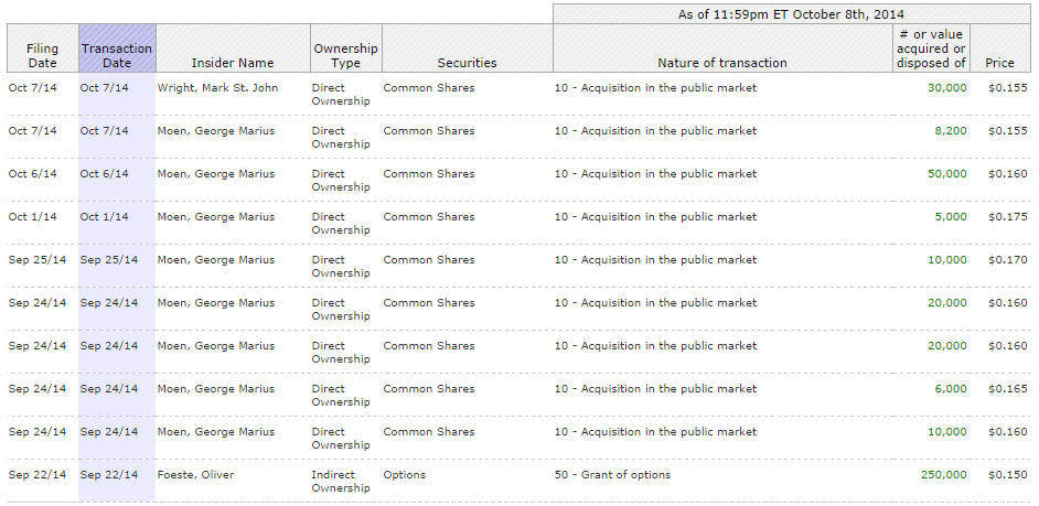 Die Marktkapitalisierung von Inca One Gold liegt derzeit bei nur ca. 9,6 Mio. CAD. Durch den Cashflow, der ab dem Jahr 2015 einsetzten wird, sollte das Unternehmen keine Kapitalerhöhung mehr benötigen, was wiederum den Aktionären zugute kommt. So scheinen es auch die Insider zu sehen, denn diese Kaufen zu den aktuellen Kursen eigene Aktien über den Markt.