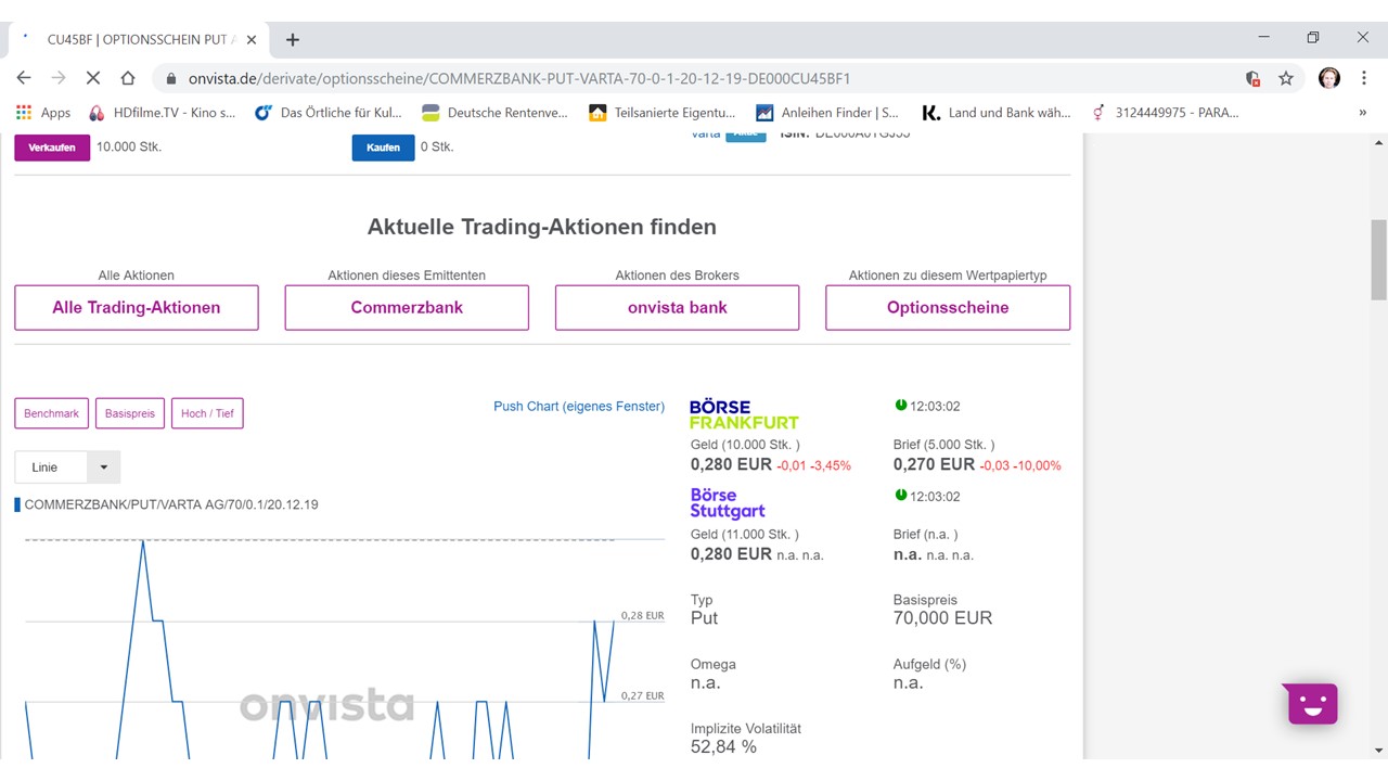 Hat die Commerzbank den Anstieg der VARTA Aktien (WKN A0TGJ5) durch hohe Käufe am 03.09.2019 unterstützt? Dieser Gedanke drängt sich einem auf, weil am darauffolgenden Tag am 04.09.2019 der Verkauf von weiteren Varta-Puts (z.B.: WKN CU45BF) zu diesem künstlich hochmanipulierten Kurs eingestellt wurde und nur der Ankauf von Puts zum auf die Hälfte gesunkenen Werts möglich war. Denn die Commerzank wusste selber, dass die Aktien künstlich manipuliert wurde und dementsprechend nach den Manipulationskäufen durch die Commerzbank am 03.09. anschliessend wieder sinken wird. Dadurch kamen heute am 04.09.2019 absurde Situationen zustande wie über 2 Stunden lang ein höhrer Briefkurs als Geldkurs beim Put (WKN CU45BF)