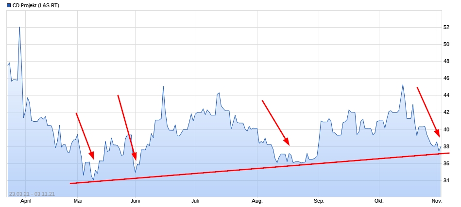 Ansonsten kann man auch eine positive Divergenz abwarten, also wenn CDPR gegen den Gesamtmarkt steigt. Das ist aktuell aber Wünschdirwas.