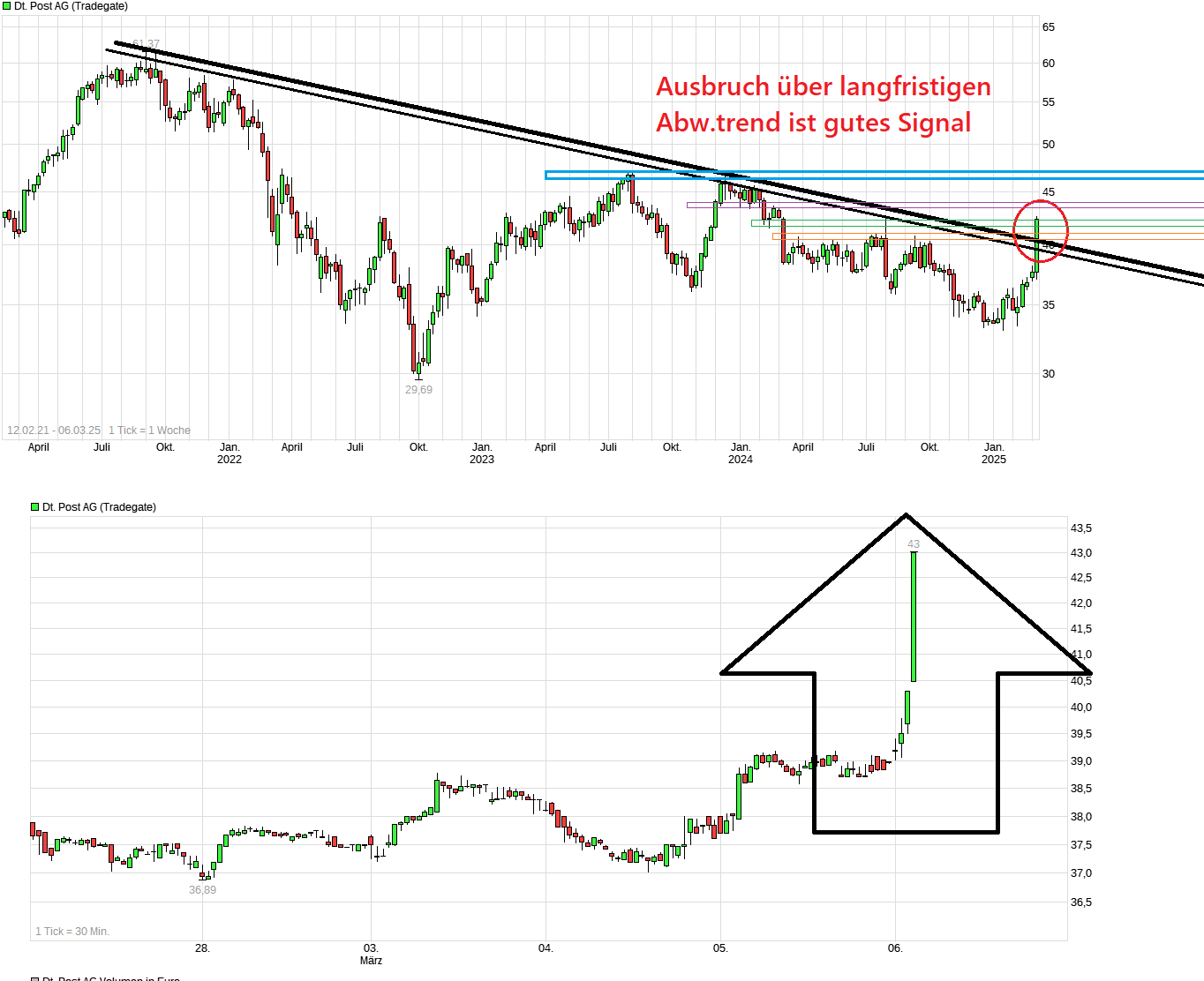 Puuh..43€?!?!...Also mit der starken Kursreaktion hatte ich so nicht gerechnet, auch wenn ich gehofft hat die 24er Zahlen sind vielleicht doch punktuell besser als erwartet. Gleichzeitig flippt der DAX wieder zur Eröffnung so hysterisch nach oben aus, daß quasi allles auch in diesem Sog hochgezogen wird. Damit hat man endlich auch den langfristigen Abwärtstrend gebrochen und somit also größere Hindernisregion nun den Bereich von ca. 47€ über sich. Wenn der DAX weiter täglich im hysterischen Kaufrausch so läuft, dann kann das natürlich auch noch angelaufen werden in nicht so ferner Zukunft. Glaube ich aber nicht so ganz, da natürlich der DAX das nicht so weiter machen kann ohne auch mal wieder auszuatmen.