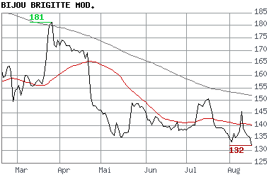 Bijou Brigitte-Papiere verlieren ohne Nachrichten vier Prozent. Damit setzt der Hersteller von Modeschmuck seinen monatelangen Negativtrend weiter fort. Seit Anfang 2006 halbierte sich der Kurs von 254 auf jetzt noch 123 Euro.