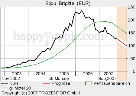 Millionen Euro. In einem Ausblick auf den Rest des Jahres äußerte man sich von Unternehmensseite jedoch sehr verhalten. Die Hochrechnung des Quartalsergebnisses lässt nicht erwarten, dass Bijou Brigitte den Jahresgewinn steigern wird. Es ist im Gegenteil sogar mit einem ganz leichten Rückgang zu rechnen. Dieser Paukenschlag sorgte dann auch prompt für einen neuerlichen Kursrutsch. Die Aktie verlor kurzfristig noch einmal über 30 EUR.