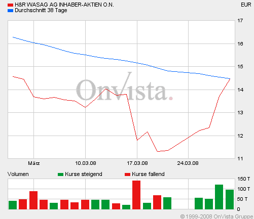 Die Aktie von H&R WASAG verliert aktuell 0,88 Prozent auf 14,57 Euro. (28.02.2008/ac/n/nw)
