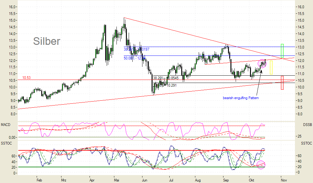 Kurz-Kommentierung: SILBER rutschte vergangene Woche intraday nochmals unter die exp. GDL 50 (EMA50) zurück, wurde aber unmittelbar wieder hochgekauft und pendelt nun seit mehreren Tagen zwischen 11,80 und 12,16 $ seitwärts. Das kurzfristige Chartbild ist weiterhin neutral zu werten, wobei die bullischen Tendezen auf Grund Stabilisierung auf hohem Niveau weiter erhöhen. Steigt SILBER jetzt per Tages- und Wochenschluss über 12,16 $ an, wird ein kurzfristiges Kaufsignal mit ersten Zielen bei 12,64 und 13,40 $ ausgelöst. Prallt SILBER hier bei 12,16 $ hingegen nach unten hin ab und fällt per Tagesschluss unter sind nochmals Abgaben bis 11,50 - 11,60 $ und darunter 11,08 - 11,11 $. Erst ein signifikanter Rückfall unter 11,00 und anschließend 10,40 $ löst ein Verkaufsignal mit Zielen bei 9,23 - 9,50 und ggf. 8,43 $ aus.