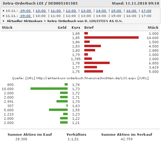 Eintagsfliegenbetrachtungen helfen nicht weiter. Die Aktie ist stark gestiegen. Da haben heute welche 100k abgeworfen und Gewinne mitgenommen. Warten wir mal den Zwischenbericht III 2010 ab. Wenn sich die Ertragsziele bestätigen, wird es auch Richtung Euro 1,70 abgehen.