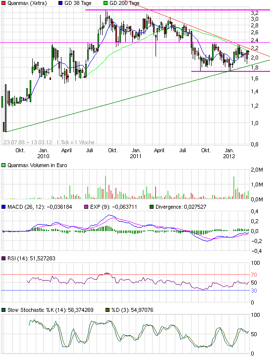 Der Fundamentalanalytiker wird sagen, dann verschenkt man ja die ersten 10-15%, aber da kommts dann drauf an wie man Chartanalyse betrachtet. Ist es nur selbsterfüllende Prophezeihung oder zeigt es auch die derzeitige fundamentale und psychologische Komponente an, was sich dann in Trends und Widerständen äußert?! Je nachdem richtet man dann auch seine Käufe und Verkäufe aus. Ich finds immer ganz sinnvoll, gestaffelt zu kaufen. Bei Quanmax beispielsweise eine Position schon im Depot, die zweite jetzt kaufen, die dritte entweder deutlich tiefer zu 1,7x € oder über 2,19 €. Falls man dann noch Kohle hat, könnte man über 2,35 € die letzte Position kaufen.