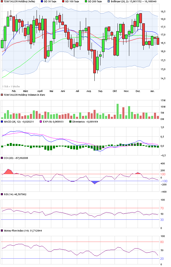 wieder näher als dem 52Wochen Hoch. Oh mann. Hätte nie gedacht, daß wir hier auf so eine lange Geduldsprobe gestellt werden. Heute gabs dann wenigstens mal wieder eine Kaufempfehlung, obwohl das Kursziel selbst von 21 auf 20 reduziert wurde, weil angeblich das 4. Quartal schwächer ausfallen dürfte als von TT prognostiziert. Die Meldung kam von BNP Paribas, wobei keine konkreten Zahlen genannt wurden. Das ist ein bißchen mager zumal nicht erklärt wurde, warum bei TT das 4. Quartal schwächer ausgefallen sein dürfte. Lt. Einzelhandel war der Umsatz für das Weihnachtsgeschäft aber durchaus durchwachsen bzw. schwach. Lt. stat. Bundesamt das schwächste Umsatzplus seit 4 Jahren. Hier die Meldung http://www.deutsche-mittelstands-nachrichten.de/2014/01/58313/