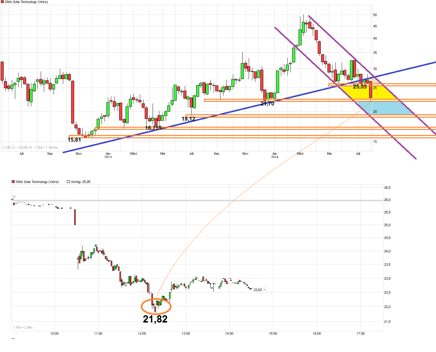 länger angeschlagen. Der Rutsch durch die 25,35 kam jetzt nicht gut an. Kurzfristig kommt es jetzt darauf an, ob die 21,70 fallen oder verteidigt werden. Das heutige Tagestief war 21,82. Geht es unter 21,70 (Low von Dez.2013) , dann wäre das Fenster nach unten geöffnet bis in den Bereich 19,12 (Low Anfang Juli2014). Im Moment jedenfalls alles weiter noch sehr fragil solange man so nahe an der 21,70 bleibt.