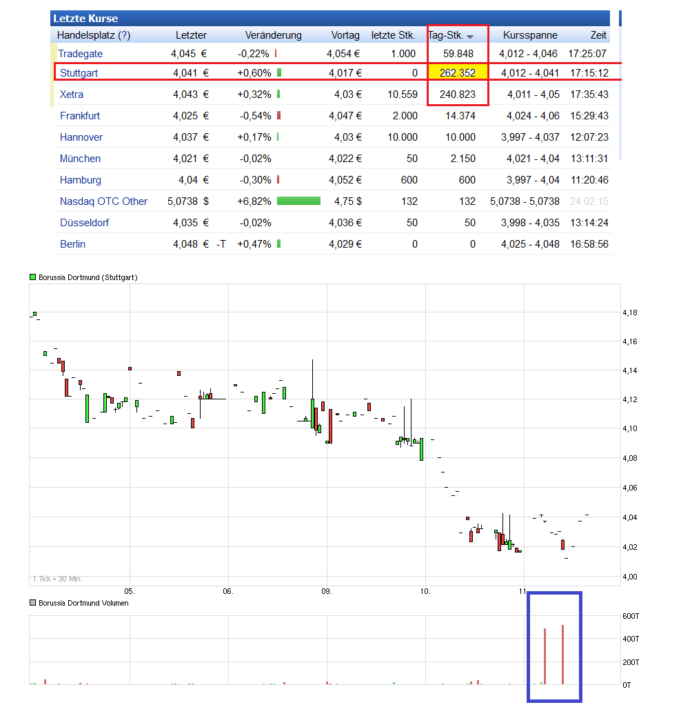 ...kam dies schonmal vor, dass über Börse Stuttgart knapp 375.000 Aktien gehandelt worden waren.Da hatten wir schonmal geschrieben, dass über diese Börse wenig BVB Aktien gehandelt werden.Ich wüsste auch gerne, welche Parteien sich die Aktien zuschieben...