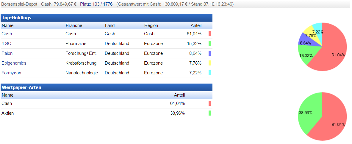Im Augenblick befinden sich 4SC, Epigenomics, Paion und Formycon im Depot. Die Einzelheiten bitte ich euch der Aufstellung zu entnehmen. So, das wärs für heute. Ich wünsche euch noch viel Glück bei euren Entscheidungen.