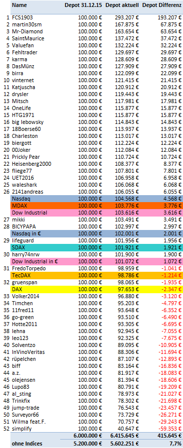 Der Durchschnitt über alle Depots liegt mit 7,4% im Plus - hätte man da ein Wikifolio draus gemacht, hätte es sich ganz gut geschlagen und das ohne einen Kauf oder Verkauf das ganze Jahr über.