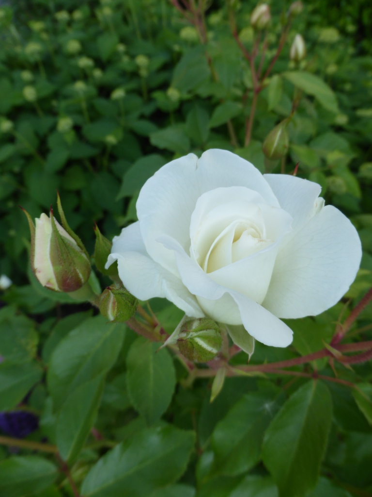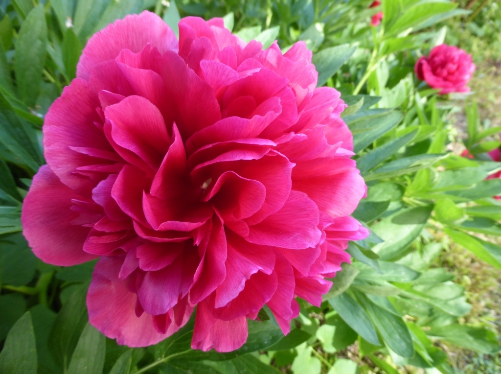 Die Wirrungen einer Pfingstrose - hat sich in weißer Vorhersicht, der schweren offenen Blüte nach dem üppigen Regen mal gerade eben selbst gestützt :-)))