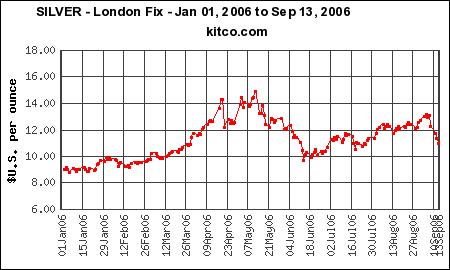 Einbruch des Silberpreises kurz nach April 2006, als dem Markt klar wurde, dass der ETF jedenfalls derzeit Einlagegelder nicht wie behauptet 1:1 in physischem Silber anlegt.