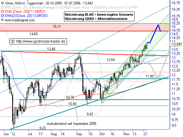 Rückblick: Ausgehend vom Unterstützungsbereich aus exp. GDL 50 (EMA50) auf Wochenbasis und Aufwärtstrend seit September 2005 steigt SILBER seit September wieder an, wobei Ende November der Ausbruch über den zentralen Widerstandsbereich bei 13,16 - 13,40 $ gelang. Damit wurde ein kurzfristiges Kaufsignal ausgelöst. Gestern markierte das Edelmetall dann ein Zwischenhoch bei 14,19 $ und startete eine Abwärtskorrektur, welche heute bereits den Aufwärtstrend seit Oktober bei 13,52 $ erreicht. Das Chartbild ist auf sämtlichen Zeitebenen bullisch zu werten.