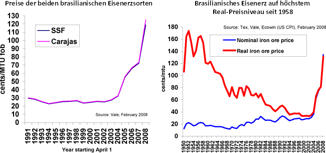 Vale, der brasilianische Eisenerzproduzent, kündigte Anfang letzter Woche an, dass es mit japanischen Stahlproduzenten Übereinkünfte bezüglich von Preiserhöhungen für Eisenerz gegeben habe. Das Erzprodukt nach Southern System Fines (SSF - 65%-66% Eisenanteil, 9% Feuchte – geringe Verunreinigungen) solle sich um 65% verteuern, die Erzsorte Carajás (67% Eisenanteil, 5% Feuchte, geringe Quarz- und Phosphorverunreinigungen) um 71%. Die Preise (fob - Free on Board) gelten für nur für Transport und Beladung des Schiffes, ausschließlich der Frachtkosten zum Importhafen. Es gilt als möglich, dass die australischen Eisenerzproduzenten in einem nächsten Schritt stärkere Preiserhöhungen anvisieren, was zu Widerstand und Verhandlungen seitens der Stahlwerksbetreiber führen werde, so Macquarie Research in ihrem jüngsten News-Letter. Die letzten Preiserhöhungen mit eingerechnet, stieg SSF-Eisenerz seit 2002 um 377%. Damit erreicht brasilianisches Eisenerz ist die höchsten realen (inflationsbereinigten) Preisstände seit 1958 gestiegen (siehe Grafik).