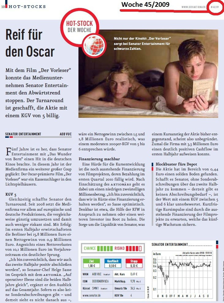 DerAktionär hat 2009 Senator als "HotStock der Woche" empfohlen.