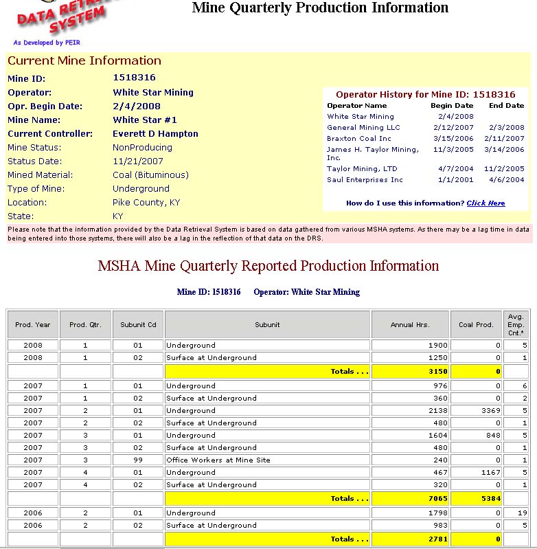 Der "Mine Report" wird mir zBsp. unter http://min­emaps.ky.g­ov/MineRep­ort.aspx?S­FN=18429 zur Verfügung festellt. Ist jetzt nicht mehr aufbereite­t!