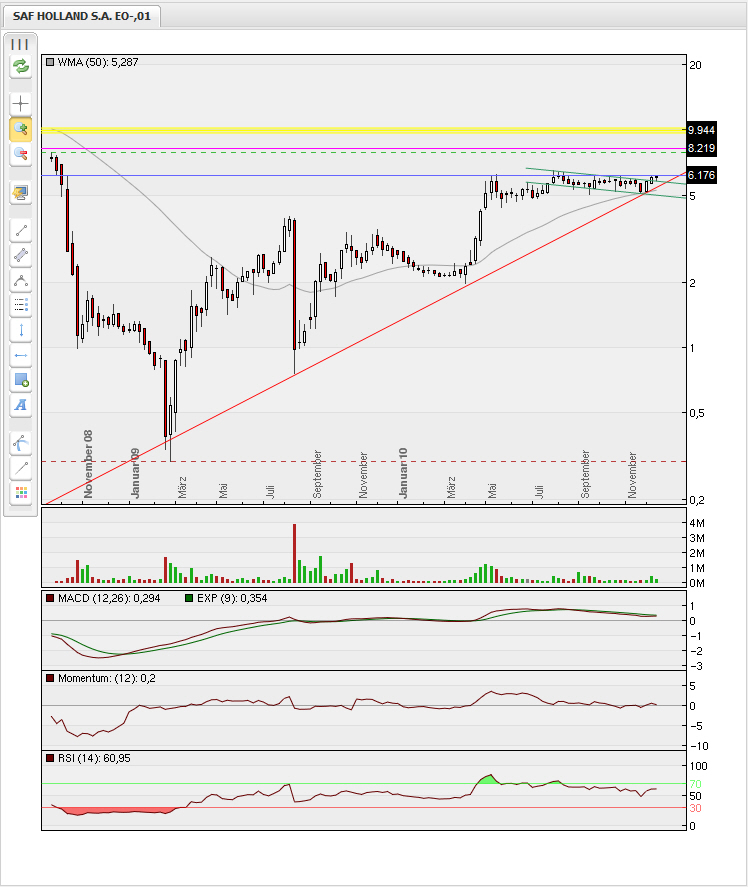 Hier bei SAF sehe ich beste Chancen die alten Höchststände bald wieder zu sehen, da zum gleitenden Kursdurchschnitt der letzten Jahre noch luft ist, kann man hier eine schöne Performence einfahren.Die Roadshow wird die Investoren ( Fonds) überzeugen und der S-Dax aufstieg fast schon zwingen müssen, in der Aktie investiert zu sein. Die Ausrichtung der SAF ist bestens und hoffe auf baldigen 7€ Kurs.