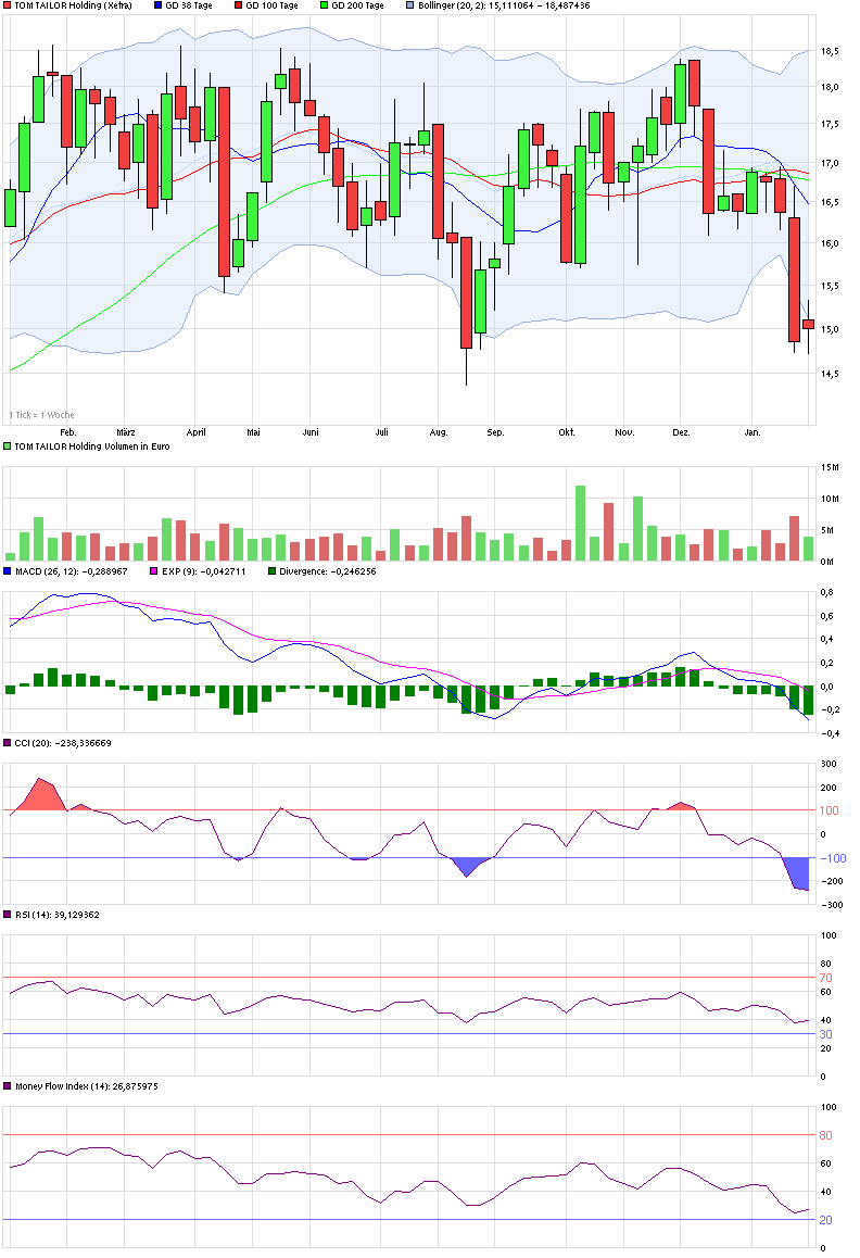 TT ist zweifelsohne überverkauft. MACD und CCI im negativen Bereich. Beim MACD fällt die nunmehr deutliche Divergenz zwischen Trigger und MACD Linie auf. Hier wird erfahrungsgemäß bald eine Entscheidung kommen, nicht selten nähert sich die MACD Linie dann dem Trigger und durchkreuzt diese. Mindestens sollte sich der Abstand aber nicht vergrößern und somit "glätten", was eine Seitwärtsphase bzw. Stabilisierung auf aktuellem Niveau mit sich bringt