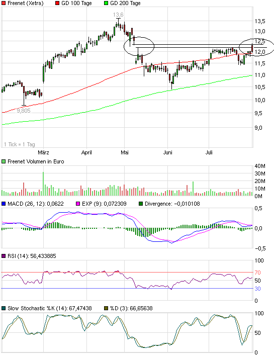 Alles auf Standby aktuell und man wartet auf die Details der kolportierten EZB Doppelstrategie. Das Verweilen läuft auf realtiv hohen Kursständen weiter ab. Der Markt erwartet offenbar zu 99%, daß die EZB/Draghi liefern wird, nachdem man sich soweit im Vorfeld schon aus dem Fenster gelehnt hat. Nur eben dieses 1% Restrisiko könnte heftig die Suppe der Bullen versalzen. Wenn die EZB am frühen Nachmittag überzeugt, dann könnte es mit Freenet heute einen SK geben der endlich klar übe der 12,20 liegt. Also warten wir es ab.