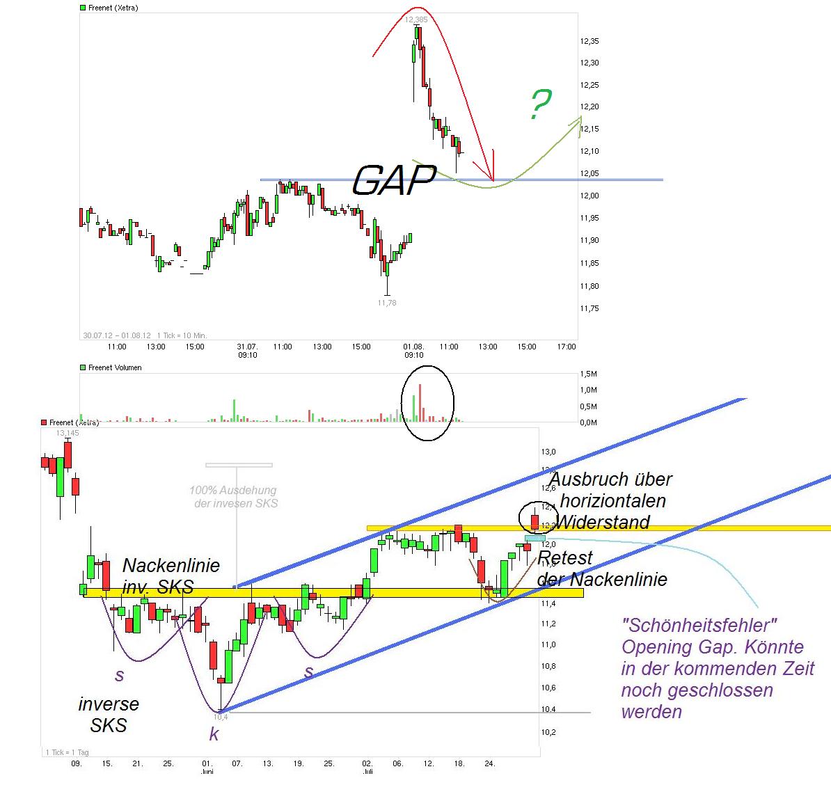 die den Kurssprung ausgelöst hat. Gibt ja genug andere solche Analysen mit ähnlichen Kurszielen und da hat die Aktie auch nicht jedesmal deswegen so einen Sprung gemacht. Zudem ist das 12 Monats- KZ mit 13,5€ nicht so wirklich weit über dem aktuellen Kurs. Wenn die 17 oder 18€ ausgerufen hätten, dann ware es eher erklärbar. Also sieht irgendwie so aus, also ob da ein "Guru" ( die Kulmbacher Börsenmafia trommelt ja schon seit Tagen und hat damit die Lunte gelegt die jemand heute angezündet hat => http://www.ariva.de/freenet-aktie/news) seine Jünger mal wieder alle gleichzeitig mit einer Kaufaufforderung versorgt hätte, damit die alle zu Börsenbeginn blind unlimitiert reinspringen und der Guru dann in bester Scalper Manier auf dem Peak die Shares verkaufen kann die er am Vorabend gekauft hat. Da konnte man auch noch die automatischen Buy Order der chartorientierten Anleger direkt zu Börsenbeginn mit auslösen, um den Peak kurz zu verstärken. Da es keine so wirklich zwingende News gab die den heftigen Ausbruch rechtfertige und zudem ein Eröffnungsgap aufgerissen wurde, ging der aufgescheuchten Herde die frühe Luft aus und man scheint sich jetzt wieder dem Gap-Close zu widmen. Interessant wäre es zu sehen was passiert, wenn das Gap geschossen werden sollte. Wenn dann wieder der Rebound nach oben käme und man sich dann wieder über den horizontalen Widerstand der letzten Zeit bei roundabout 12,20 aufmachen würde auf SK, dann bliebe das frische Chartkaufsignal weiter aufrecht und man könnte durchaus rauf spekulieren, daß es noch weiter läuft Richtung 12,80/85. In dem Bereich läge die 100% Ausdehung des "K " der inversen SKS. ( http://www.godmode-trader.de/wissen/index.php/Chartlehrgang: "...Das theoretische Kurspotenzial entspricht auch bei einer (inversen) SKS-Formation der größten Ausdehnung innerhalb der Formation..." ) . Allerdings wäre es wohl nicht verkehrt, wenn Dragi morgen auch "liefert" was der Markt sehen will. Andernfalls könnte es nochmal heftig rumpeln am Gesamtmarkt und Freenet sich dann wohl kaum ohne frische fundamentale News so einem Sog entziehen. SL würde ich momentan setzen knapp unterhalb der Nackenlinie der SKS oder unterhalb der unteren blauen Trendkanalbegrenzung