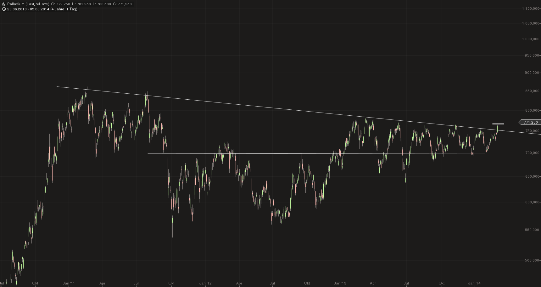 Zu Palladium denke ich, dass man nicht shorten sollte. Hat eine stabile Unterstützung bei 700 USD. Könnte erstmal an die 800 - 810 USD laufen. Heute über die 765 USD gesprungen aber ein Gap hinterlassen. Könnte mir vorstellen, dass dies nach den erfolglosen Anlauf der o. g. range noch geschlossen wird. Aber shorten würde ich es auf verdacht nicht.