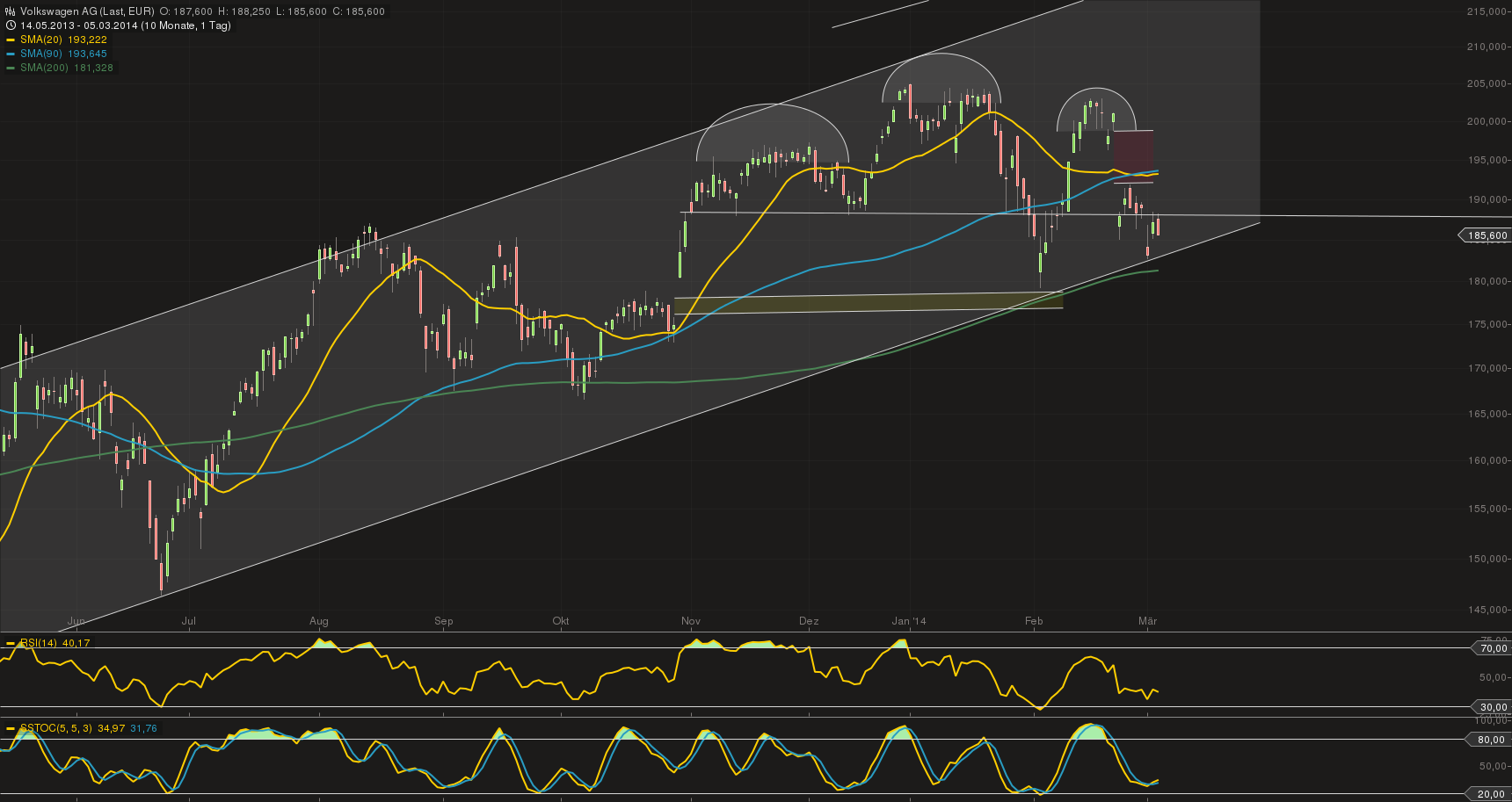 Ergebnis: VW bewegt sich zwischen der Unterstützung aus dem Aufwärtstrend und der Nackenlinie der S-K-S Formation. Ein Ausbruch nach oben bis zu den gleitenden Durchschnitten, möglicherweise Schließung des Gaps. Hält die Unterstützung mit 200 Tage-Linie nicht ist der Aufwärtstrend gebrochen. Short.
