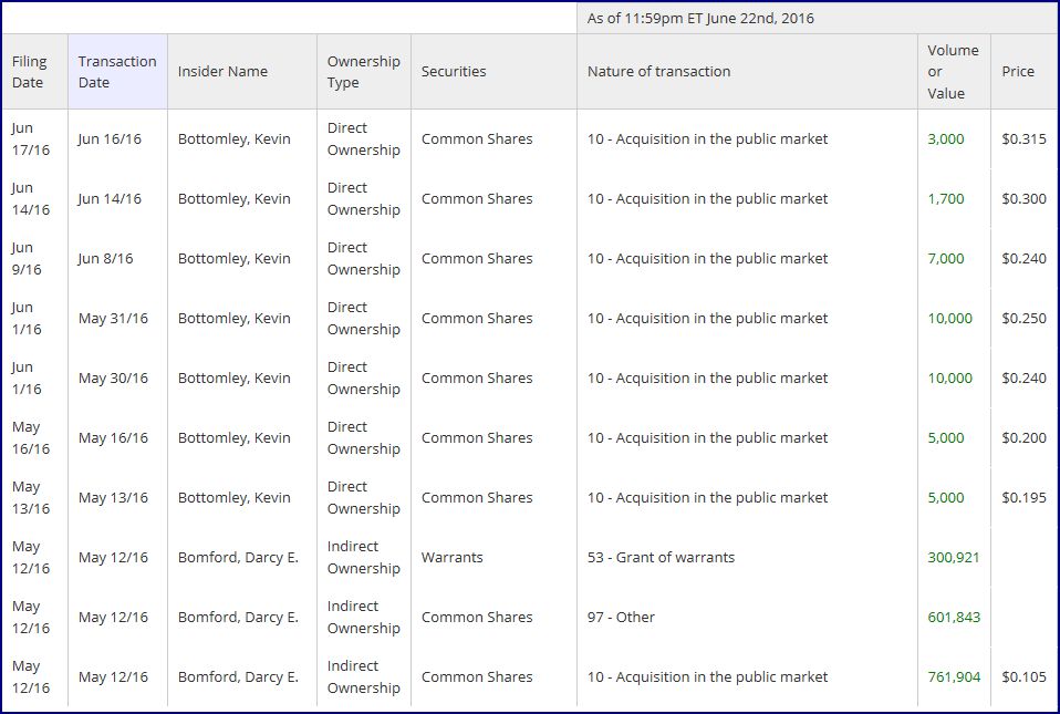 Dec 14/16 Sep 15/16 Bottomley, Kevin Direct Ownership Common Shares 10 - Disposition in the public market -20,000 $0.175