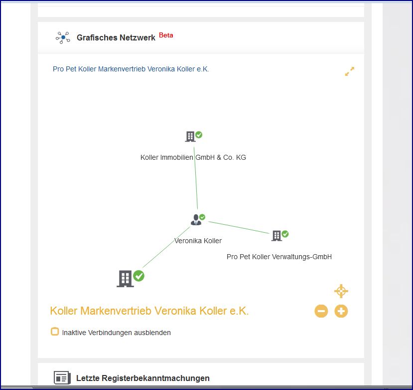 Zitat"08.07.2016 / Veränderung....HRA 3503: Pro Pet Koller GmbH & Co. KG, Schleiden-Gemünd, Kölner Straße 46, 53937 Schleiden-Gemünd. Die Gesellschaft hat nach Maßgabe des Ausgliederungs- und Übernahmevertrages vom 27.06.2016 sowie der Zustimmungsbeschlüsse ihrer Gesellschafterversammlung vom 27.06.2016 und der Gesellschafterversammlung des übertragenden Rechtsträgers vom 27.06.2016 Teile des Vermögens der Veronika Koller, , Schleiden, und zwar das Unternehmen Pro Pet Koller Markenvertrieb Veronika Koller e.K. mit Sitz in Schleiden (Amtsgericht Düren HRA 3498), als Gesamtheit im Wege der Umwandlung durch Ausgliederung übernommen. " ENDE Zitat
