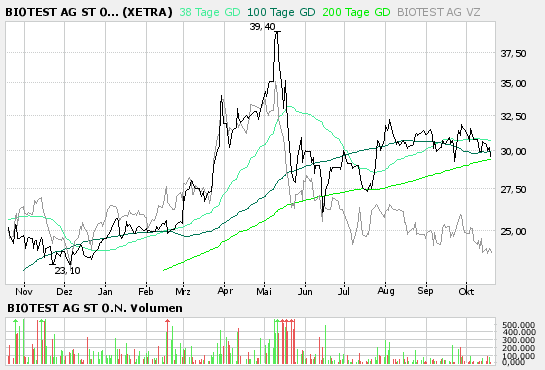Ich hoffe mal, dass die Seitwärtsbewegung bald ein Ende findet. Gegenüber vielen anderen Nebenwerten hat sich Biotest nicht besonders entickelt seit Mai und im Vergleich zu Kongurenten Stratec sehr schlecht gelaufen.