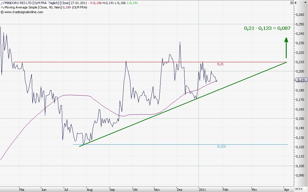 das ändert an der Charttechnik nichts, die geht davon aus, dass ALLES eingepreist ist und daraus entsteht dieses Bild. Es steht für sich allein und spiegelt den Vergangenen Markt wieder, die Aussichten können also auch nur auf den vergangenen Entwicklungen beruhen. Der Aufwärtstrend ist unverkennbar, zusammen mit der Widerstandslinie bei 0,21 ergibt das gute Aussichten.