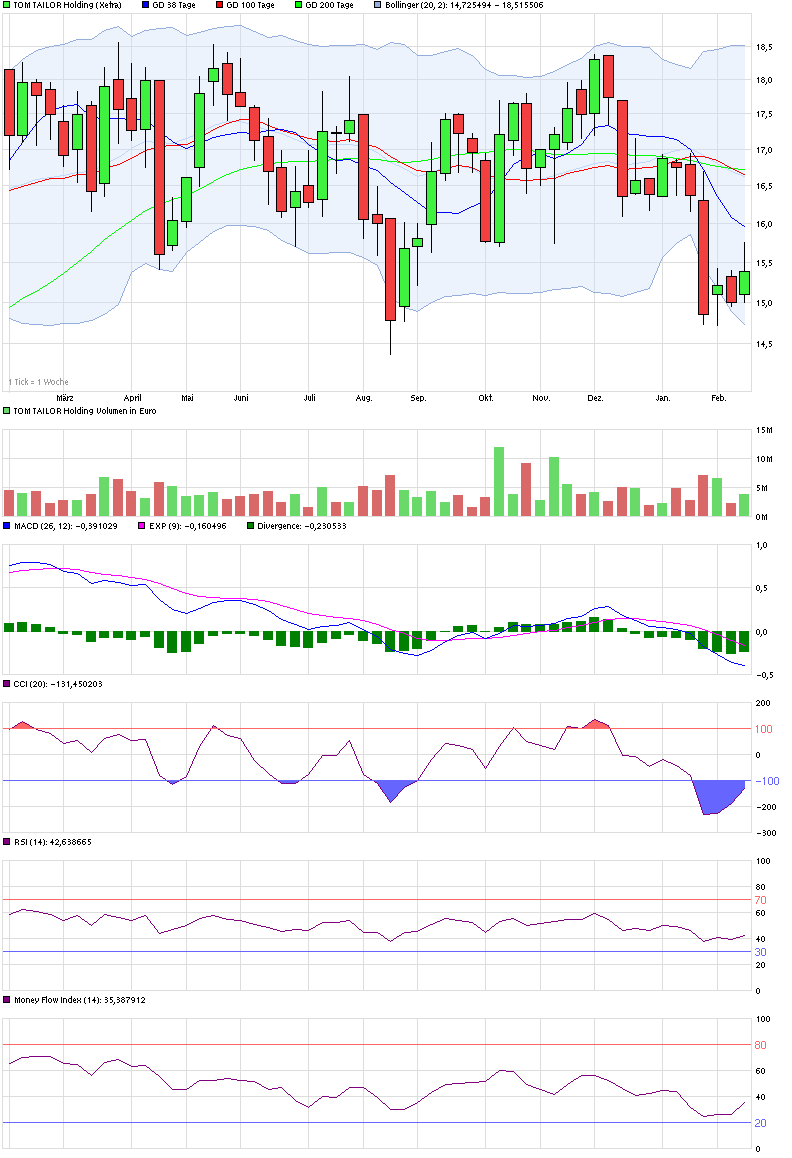 MACD hat sich nur leicht geglättet, aber immer noch stark überverkauft. So auch CCI. Erfahrungsgemäß reagiert TT ja sehr träge, daher könnten wir noch gut einige Wochen zwischen 15-16 rumeiern, um dann endlich eine neue Richtung einzuschlagen, die dann vermutlich umso heftiger ausfällt. Hier der Chart.