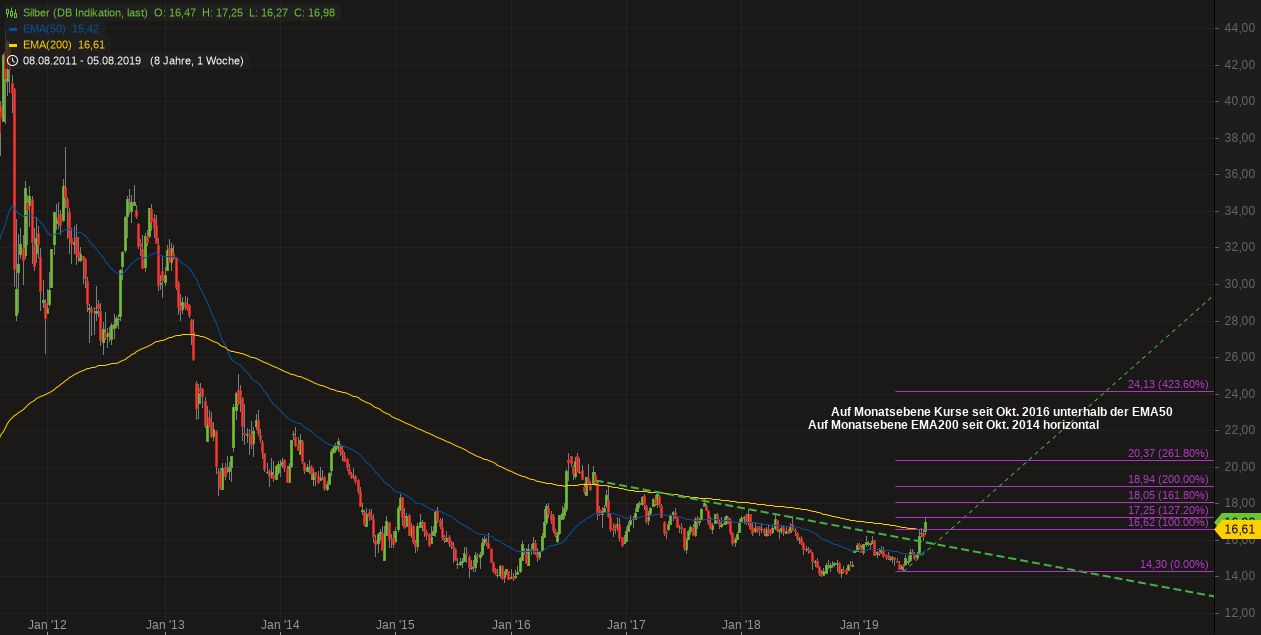 Silber schaffte es Mitte Juli 2019 aus einer massiven Abwärtstrendlinie (mit Ursprung 1/2016) nach oben auszubrechen (im 9. Anlauf). Nach einem erfolgreichen Retest dieser Line überwand das Edelmetall in der vergangenen Kalenderwoche 32 auch noch die – immer noch leicht abwärts geneigte – EMA200 (Wochenebene) und markierte exakt an der 127 %-FIBO-Projektion seinen vorläufigen Hochpunkt.