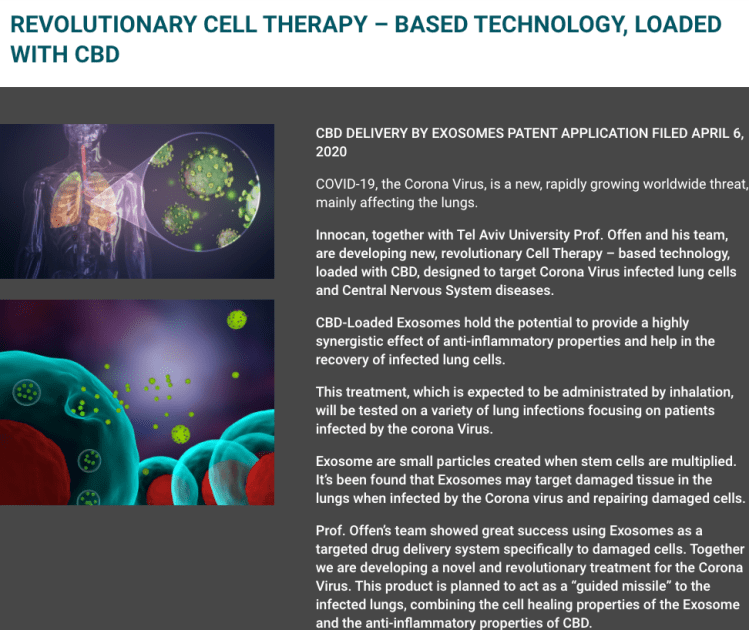 Seit der Unterzeichnung der Vereinbarung zwischen Innocan Pharma und dem Team der Universität Tel Aviv unter der Leitung von Prof. Daniel Offen über die Entwicklung eines neuen revolutionären Ansatzes zur Behandlung des COVID-19-Corona-Virus (und anderer Lungenerkrankungen) mit exosomenbeladenem CBD wurden zwei Artikel veröffentlicht unterstützen diesen Ansatz zur Beladung von Exosomen mit CBD-Molekülen.
